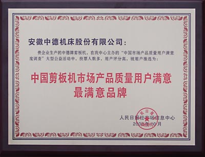 由人民日報社市場信息中心主辦、中國物流與采購聯(lián)合會、中國紡織工業(yè)協(xié)會、中國輕工機械協(xié)會等60多家權(quán)威行業(yè)協(xié)會、《工人日報》、《科技日報》等10家權(quán)威報刊、人民網(wǎng)及搜狐網(wǎng)等權(quán)威網(wǎng)站協(xié)辦支持,為期三個多月的“中國市場質(zhì)量用戶滿意度調(diào)查”大型公益活動終于揭曉。我公司生產(chǎn)的中德牌剪板機,在本次公益活動中,投票人數(shù)多,用戶評分高,被用戶推選為:中國剪板機市場產(chǎn)品質(zhì)量用戶滿意最滿意品牌。