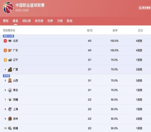 廣東男籃4連勝飆升至榜二,遼籃爆冷門,北京廣廈3隊預(yù)定四強