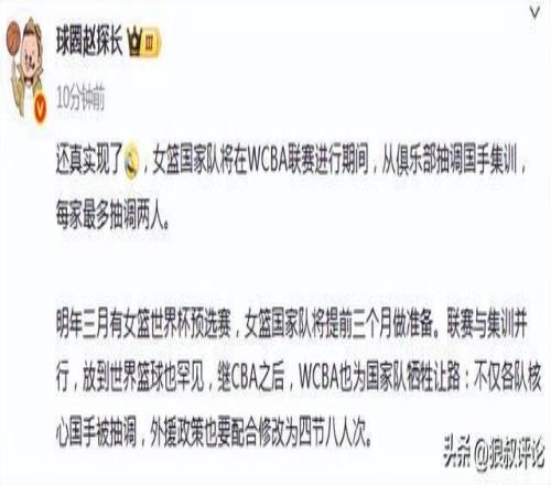 明年三月有女籃世界杯預(yù)選賽,女籃國(guó)家隊(duì)將提前三個(gè)月做準(zhǔn)備。聯(lián)賽與集訓(xùn)并行,放到世界籃球也罕見(jiàn),繼CBA之后,WCBA也為國(guó)家隊(duì)犧牲讓路:不僅各隊(duì)核心國(guó)手被抽調(diào),外援政策也要配合修改為四節(jié)八人次。