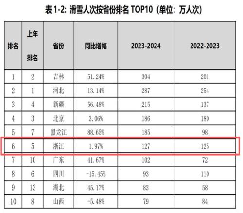 可以說,滑雪熱潮正在席卷南方。 數(shù)據(jù)顯示,目前浙江省共有室內(nèi)、室外滑雪場(chǎng)18家、滑冰場(chǎng)12家,雪場(chǎng)數(shù)量位居南方省份前列,本地人的滑雪熱情空前高漲?!?023—2024中國滑雪產(chǎn)業(yè)白皮書》顯示,2023至2024年冰雪季,全國參與滑雪的總?cè)舜芜_(dá)到2308萬,浙江以127萬人次位居全國第六,在所有南方省份中排名首位。