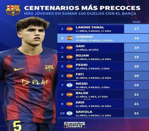 巴薩最年輕百場榜單出爐:亞馬爾第1梅西才第7