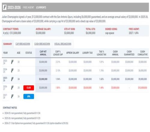 值得一提的是尚帕尼是一位落選秀,他跟馬刺簽下的合同是四年1200萬,他本賽季的年薪是300萬,下賽季他的合同還是300萬,這位24歲的身高2.01米的投手一戰(zhàn)成名了。 |