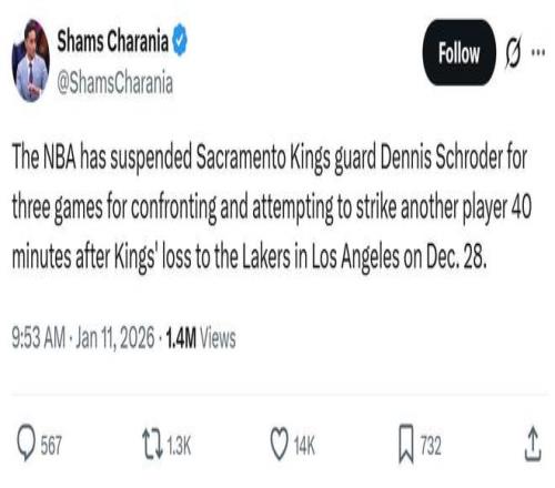 施羅德被禁賽3場(chǎng) 11日早ESPN名記Shams突然在社媒放出重磅消息,曝出國(guó)王后衛(wèi)施羅德被禁賽3場(chǎng),原因是在12月29日湖人對(duì)陣國(guó)王賽后40分鐘,施羅德與湖人一名球員發(fā)生沖突,并試圖毆打?qū)Ψ健?/p>